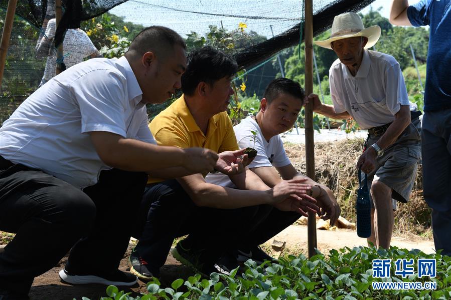 8月18日,“老监工”胡茂杰(右一)在赤水市丹润农业发展有限公司扶贫基地查看育苗情况。新华社记者 陈天湖 摄
