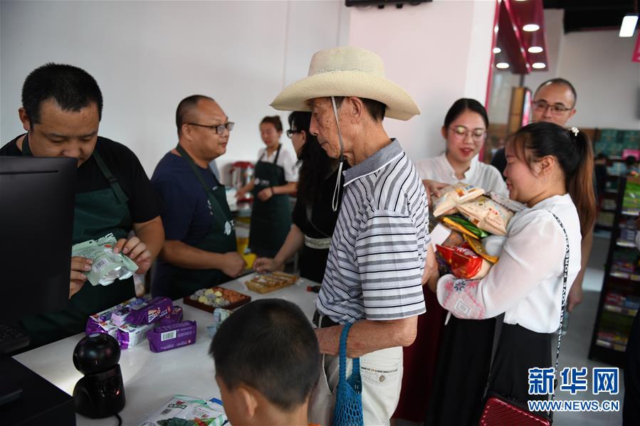 8月19日,“老监工”胡茂杰(戴帽子者)在当天开业的赤水生态保供农产品直供体验店采购。 新华社记者 陈天湖 摄